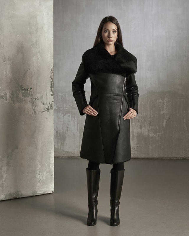 Ez a térdig érő, karcsúsított fazonú, rendkívül meleg irhakabát egy örök darab. Asszimetrikus zippzárja szabályozza a gallér méretét is. Zsebei finom bőrből készültek, ujjai zippzárral bővíthetők az alkar mentén.