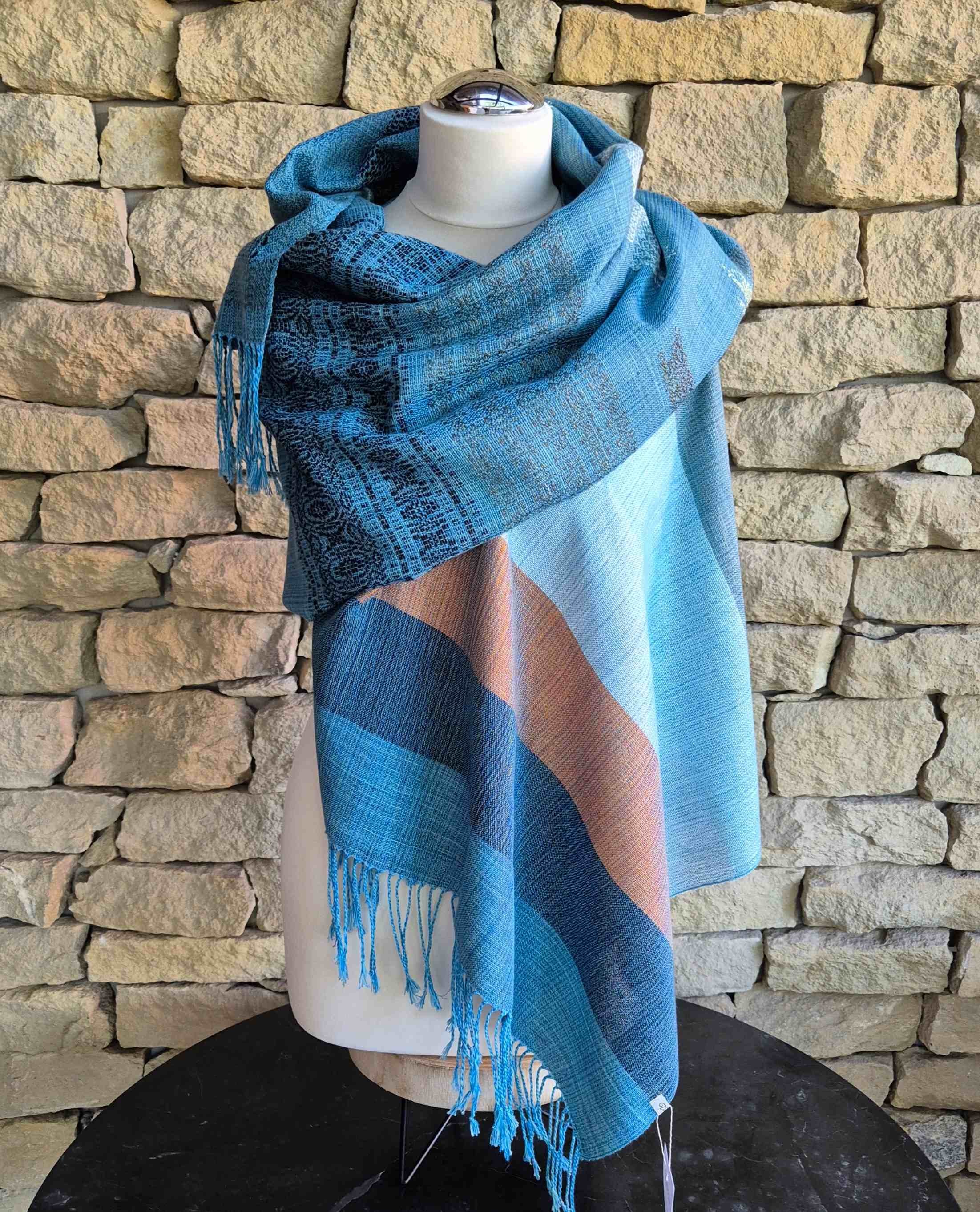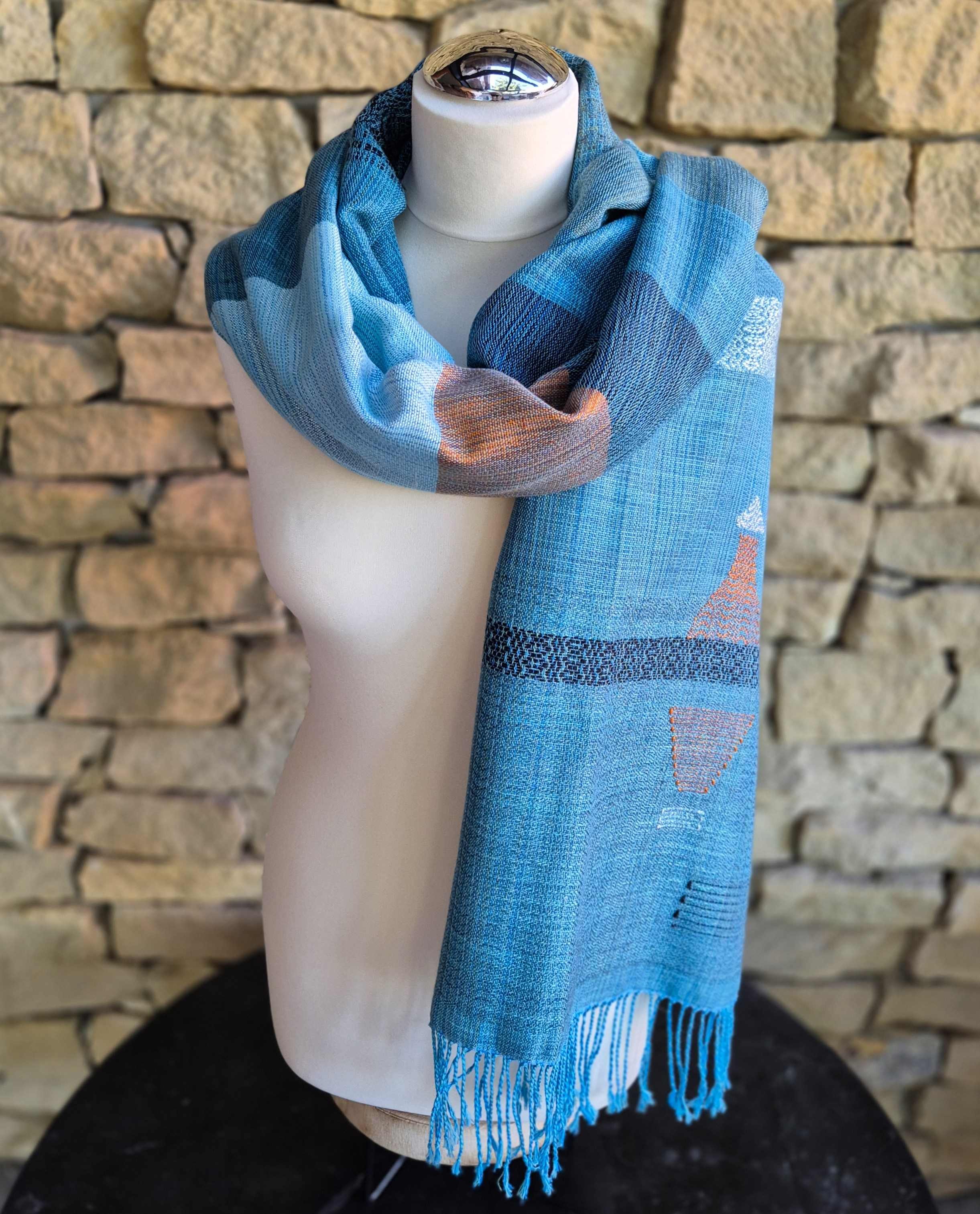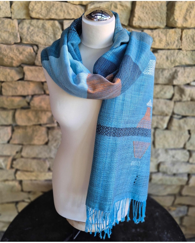 Kézzel szőtt luxus selyem stóla. Egyik fele egy japán folyón csónakázó nőt ábrázol, a másik fele ennek megfelelő színhangulatot tükrözi. Minden szövésem művészi alkotás, adott hangulatomat vagy képi inspirációmat mutatja. A termék egyedi alkotás 45-ös sorszámot kapta.