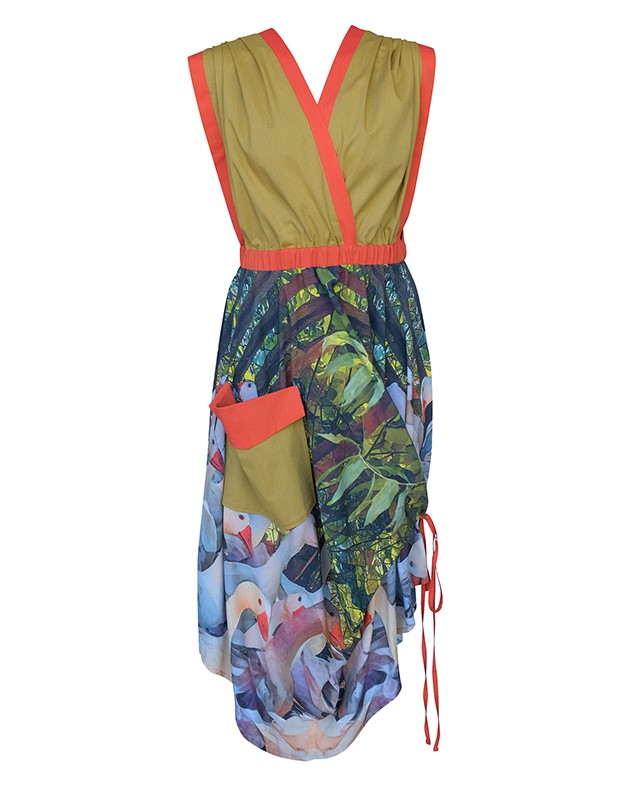 Körbe nyomtatott viszkóz vászon anyagú ruha, zsebbel, S-M és L méretekben. S-M méret: derékrész: 75-84 cm / L méret: 88-99 cm. Hossz: 100-120 cm.
