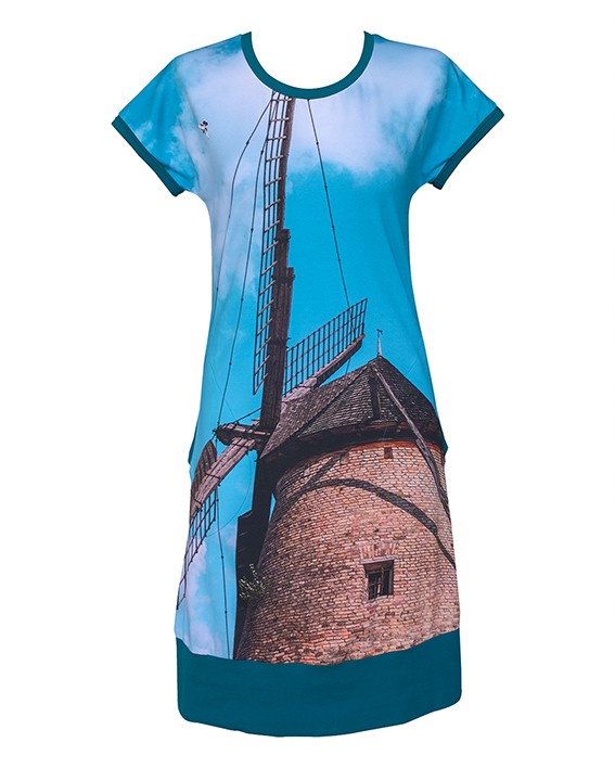 Elől nyomtatott, 100% biopamut anyagú ruha, zsebbel, S, M, L méretekben. S méret: mell 84 cm, csípő 94 cm / M méret: mell 90 cm, csípő 100 cm / L méret: mell 96 cm, csípő 106 cm. Hossz: 96 cm.