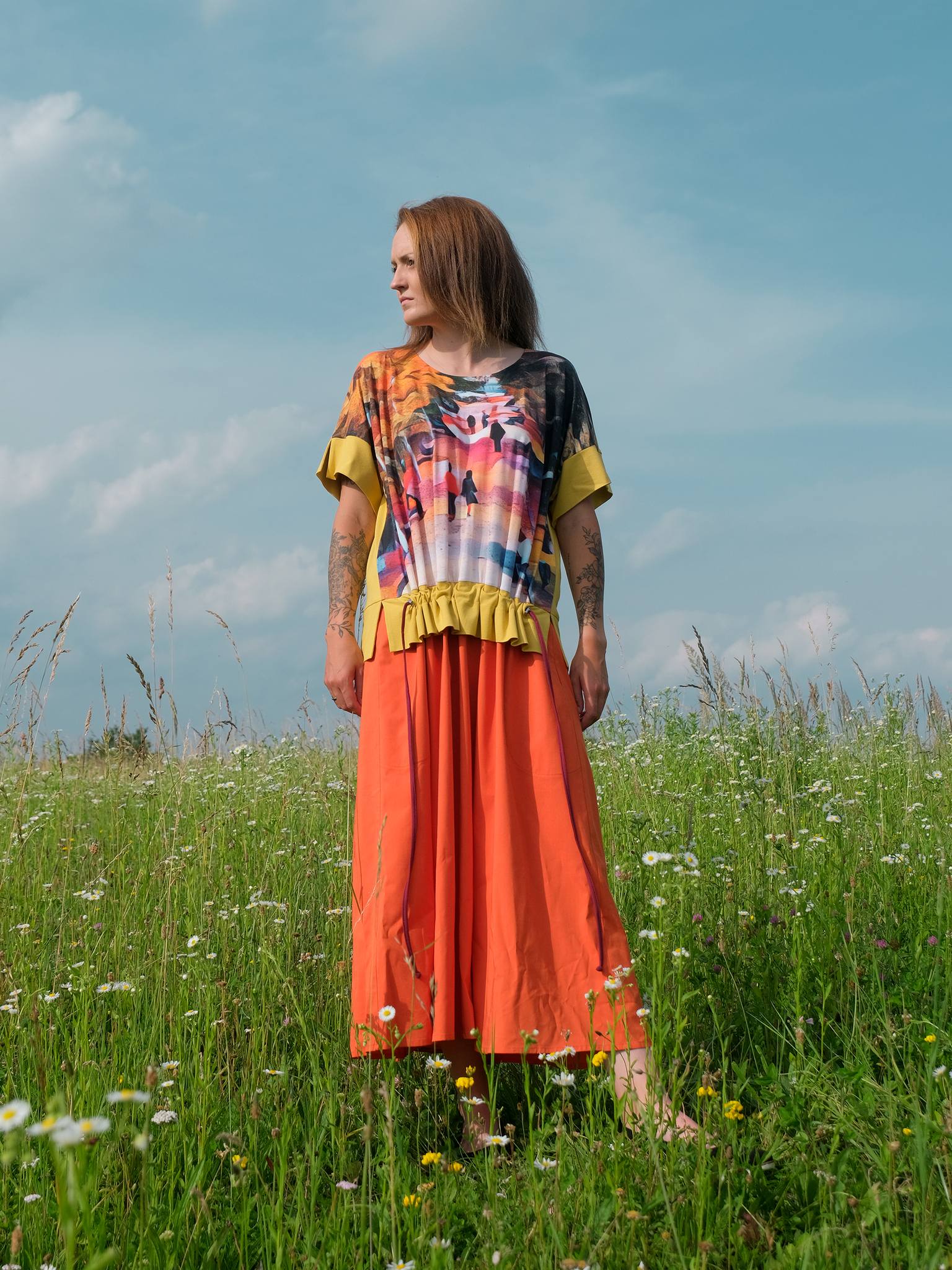 Elől nyomtatott viszkóz anyagú ruha, zsebbel, megkötővel, XS-S, S-M, L-XL méretekben. XS-S méret: mell 95 cm / S-M méret: mell 105 cm / L-XL méret: mell 115cm. Hossz: 125 cm.