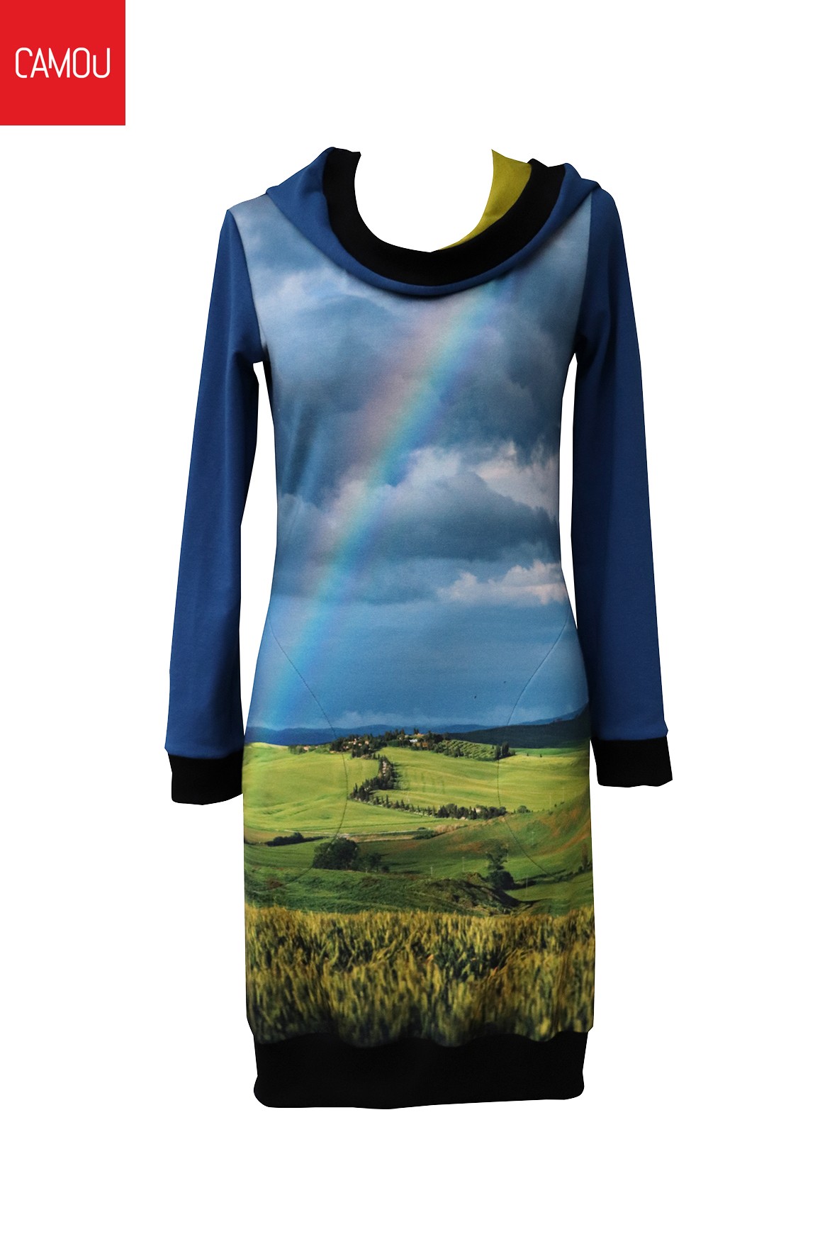Elől nyomtatott (80% pamut, 20% poly), többi részen pamut anyagú ruha, zsebbel, kapucnival, S, M, L méretekben. S méret: mell 84 cm, csípő 90 cm / M méret: mell 90 cm, csípő 96 cm / L méret: mell 96 cm, csípő 102 cm. Hossz: 94 cm. Szűkebb fazon.