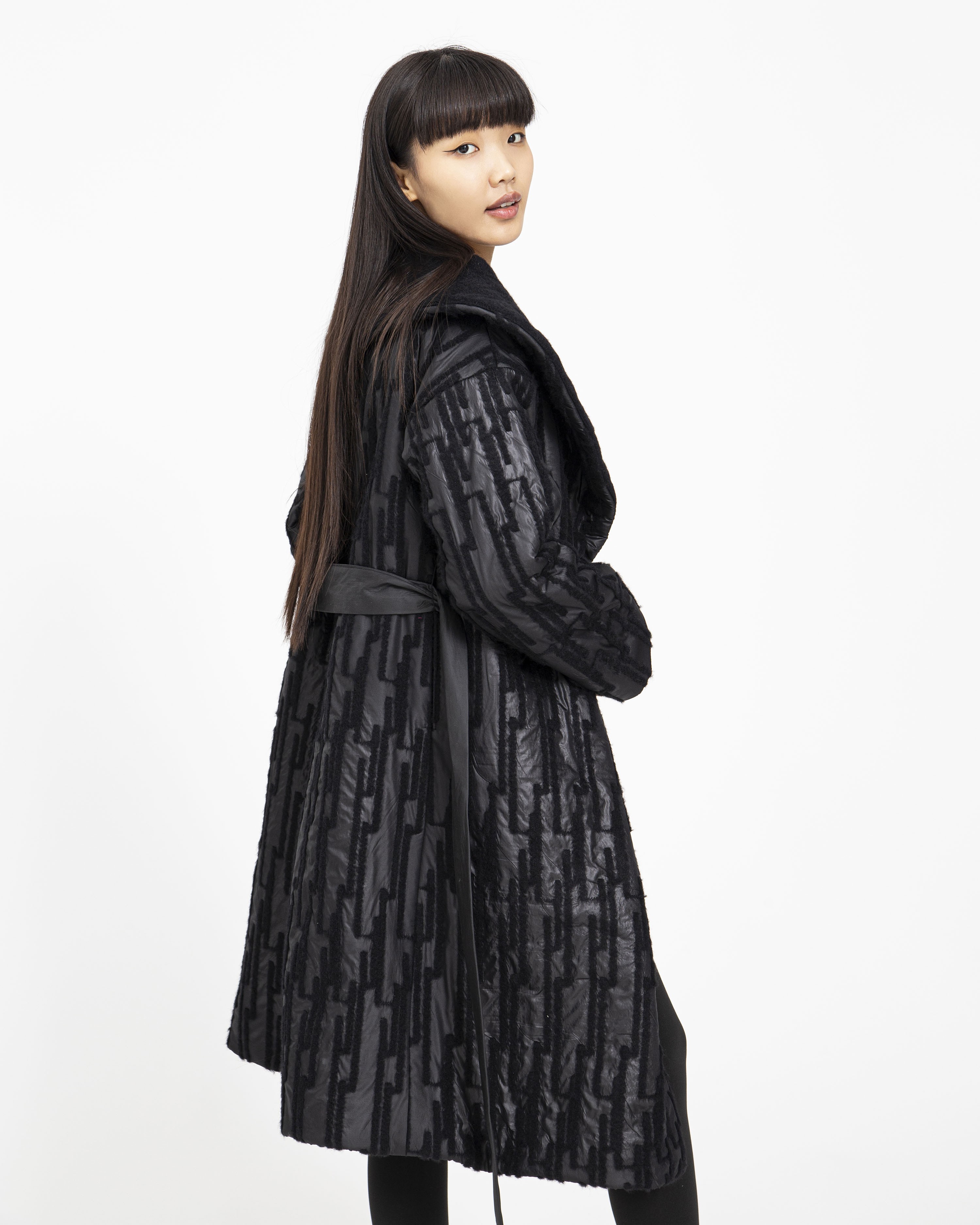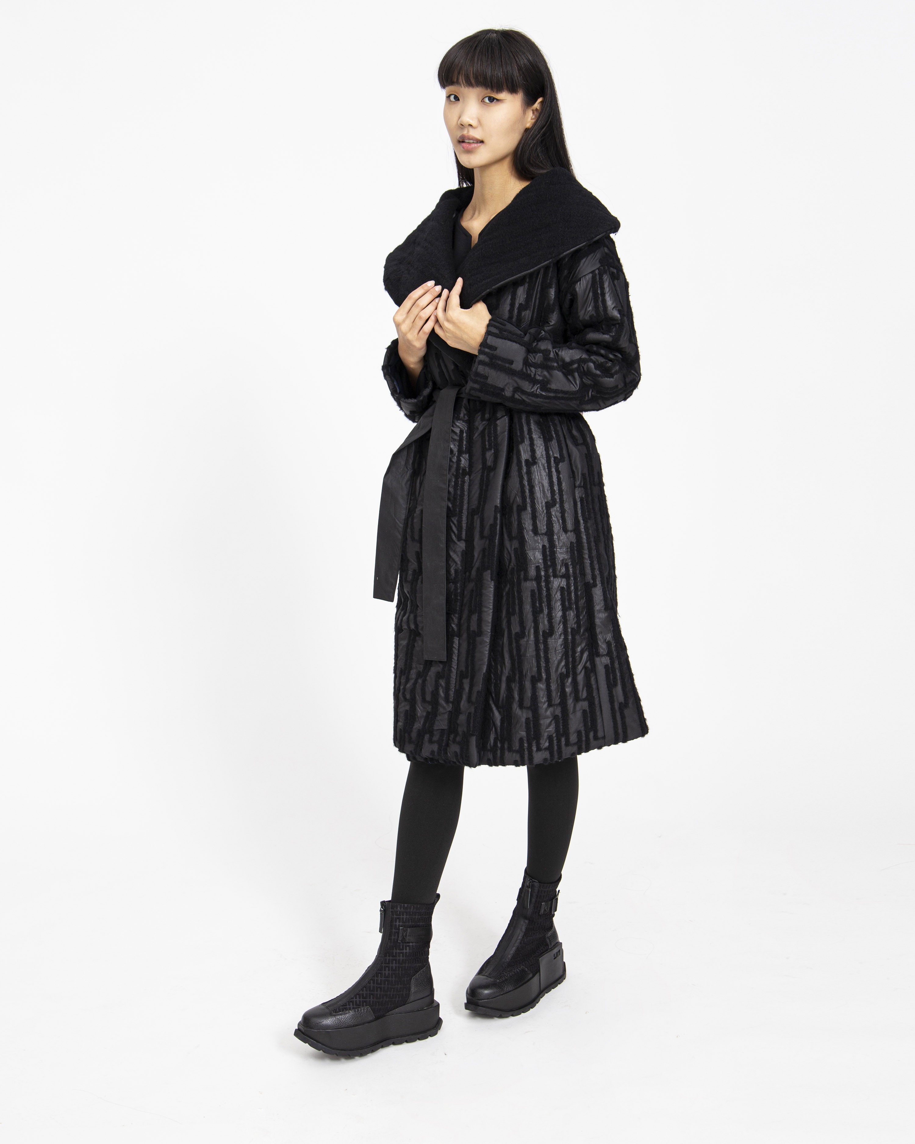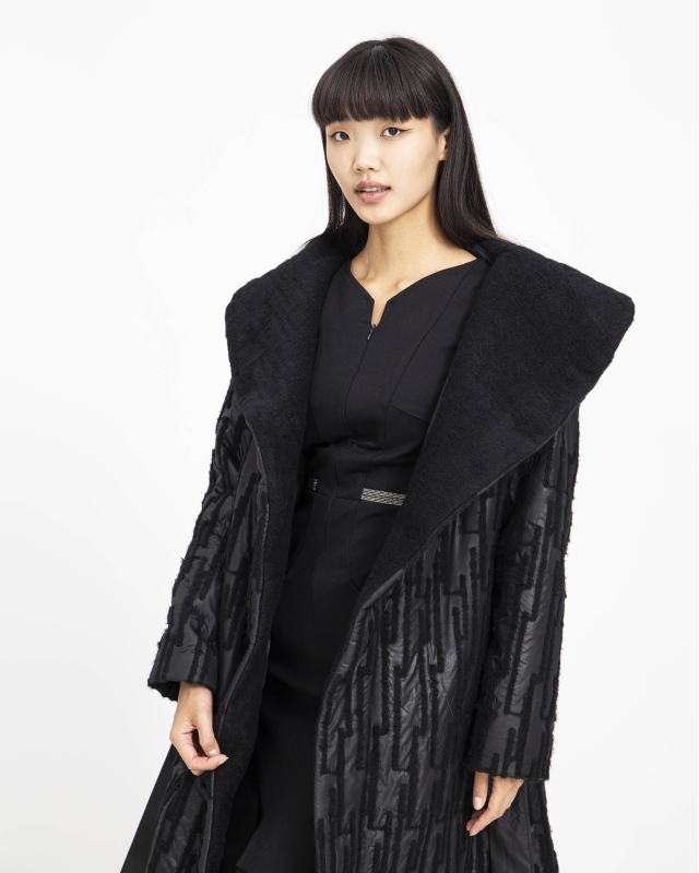 Ez a kabát egy övvel megköthető kényelmes fazon. Anyaga gyapjú, aminek külső felületén egy vízlepergetős anyag található, melybe hagyományos tűnemezelős technikával jelenik meg a gyapjú anyag mintaként. Oldalán két mély zseb is található, gallérja állítható, így hidegebb időben zártabbá tehető a kabát fazonja. A kabát bélelt.