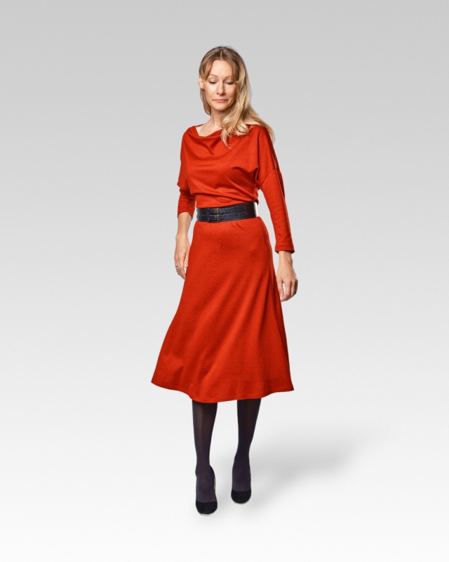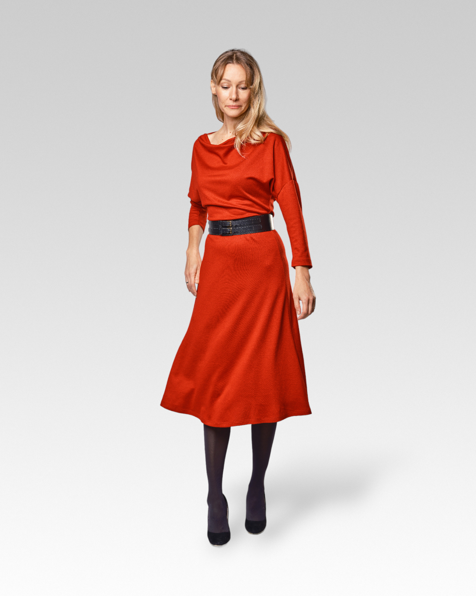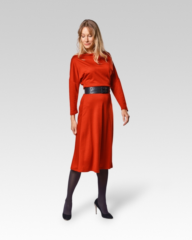 Nőies sziluettű ruha derékhangsúlyos, szoknyája enyhén bővülő, ujja háromnegyedes. A fazonhoz jól passzól egy vastag vagy egy vékony öv is. Rugalmas anyaga miatt kényelmes.