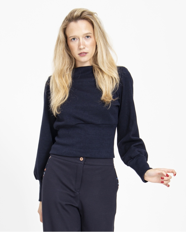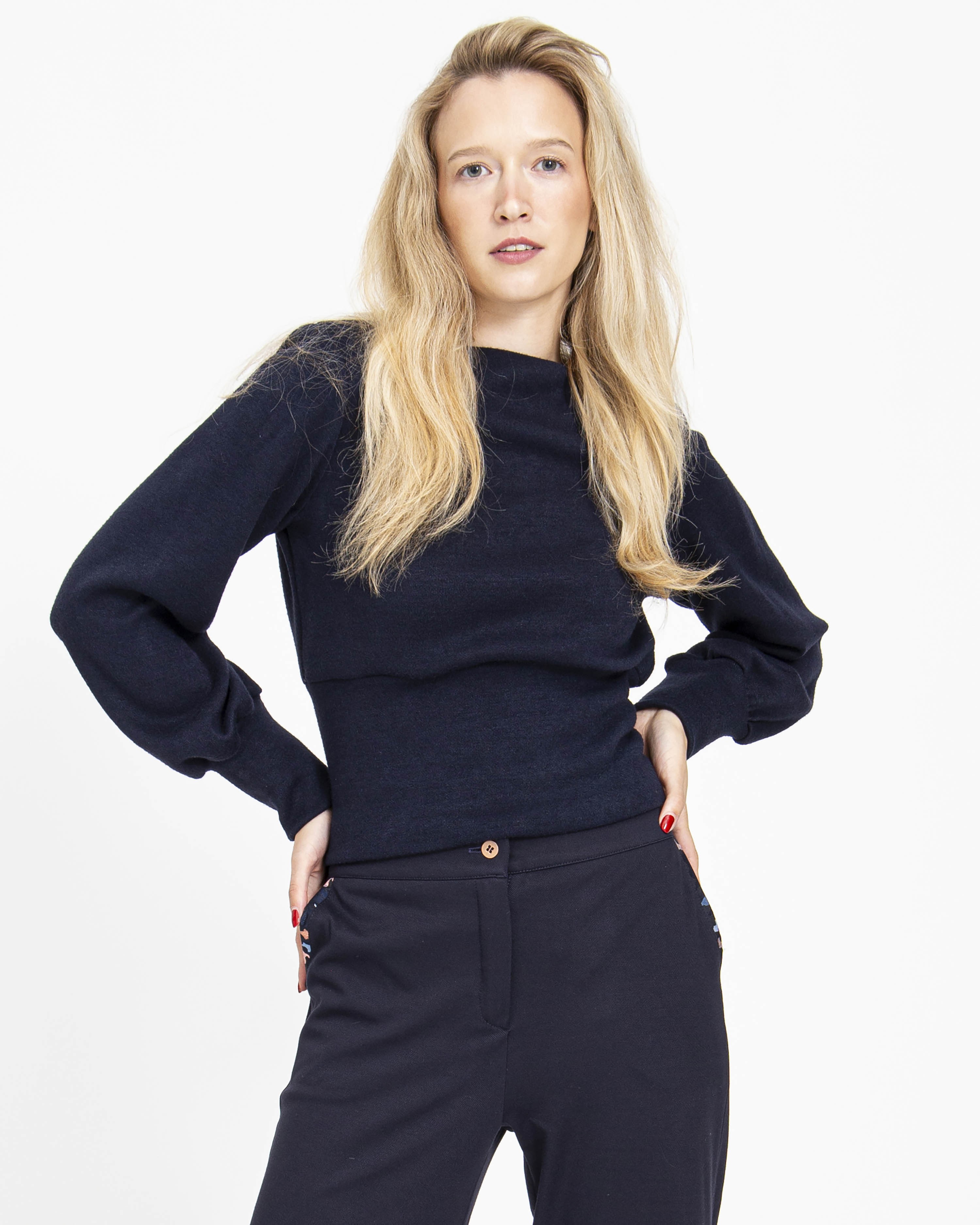 Ez a pulóver, rövid fazona ellenére meleg, hisz a paszpolos részén dulpa anyagvastagság található, így jól melegíti  és hangsúlyozza a derekat. Ujjai klasszikus és nőies stílúsú, csuklónál paszpolos szintén. ideális szoknyához és magasderekú nadrághoz is.