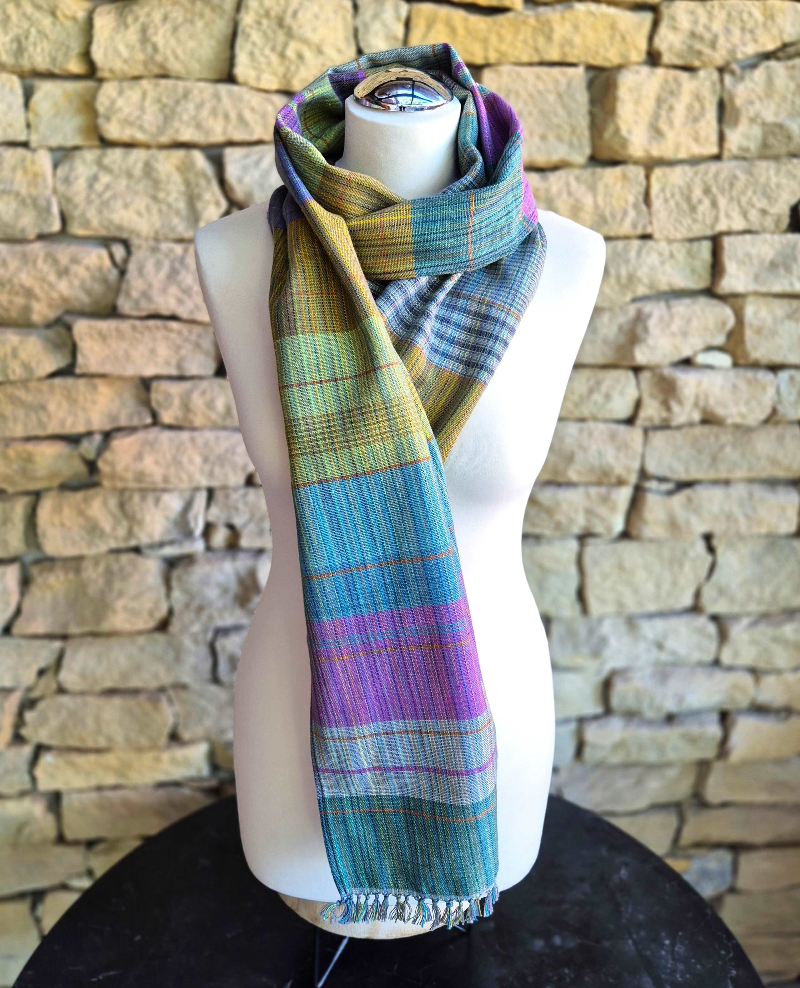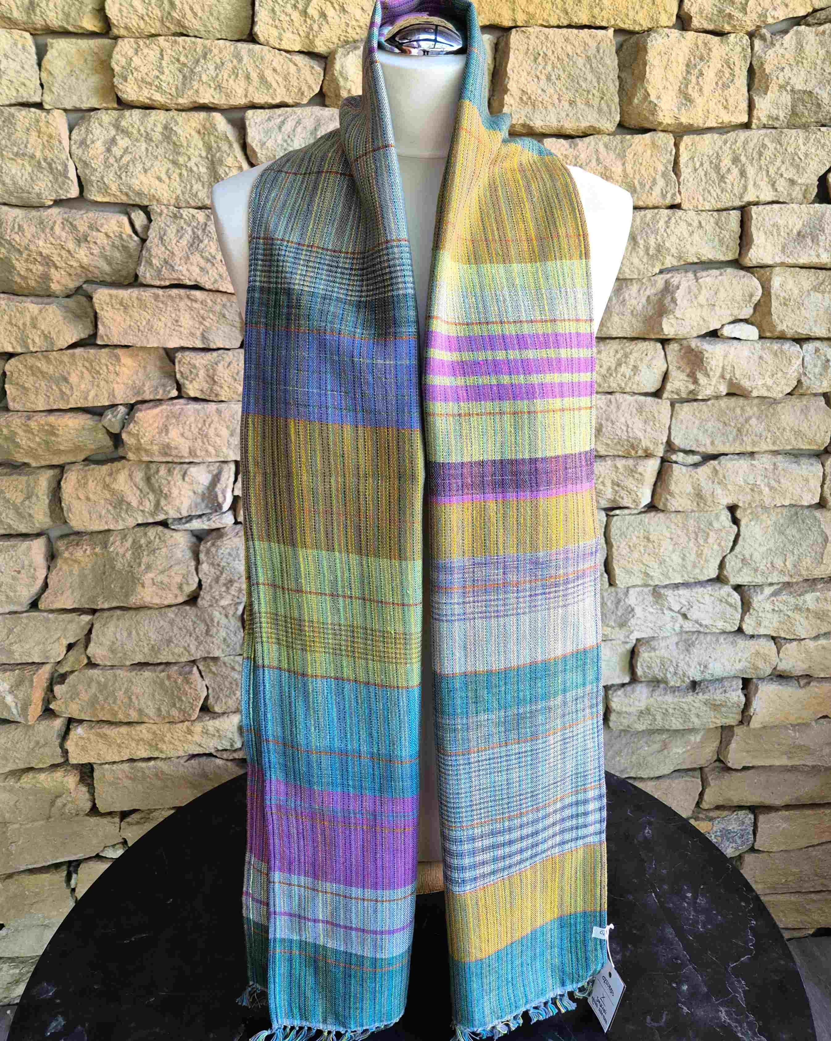 Kézzel szőtt luxus selyemsál. Nagyon színes csíkritmusos selyemsál.
