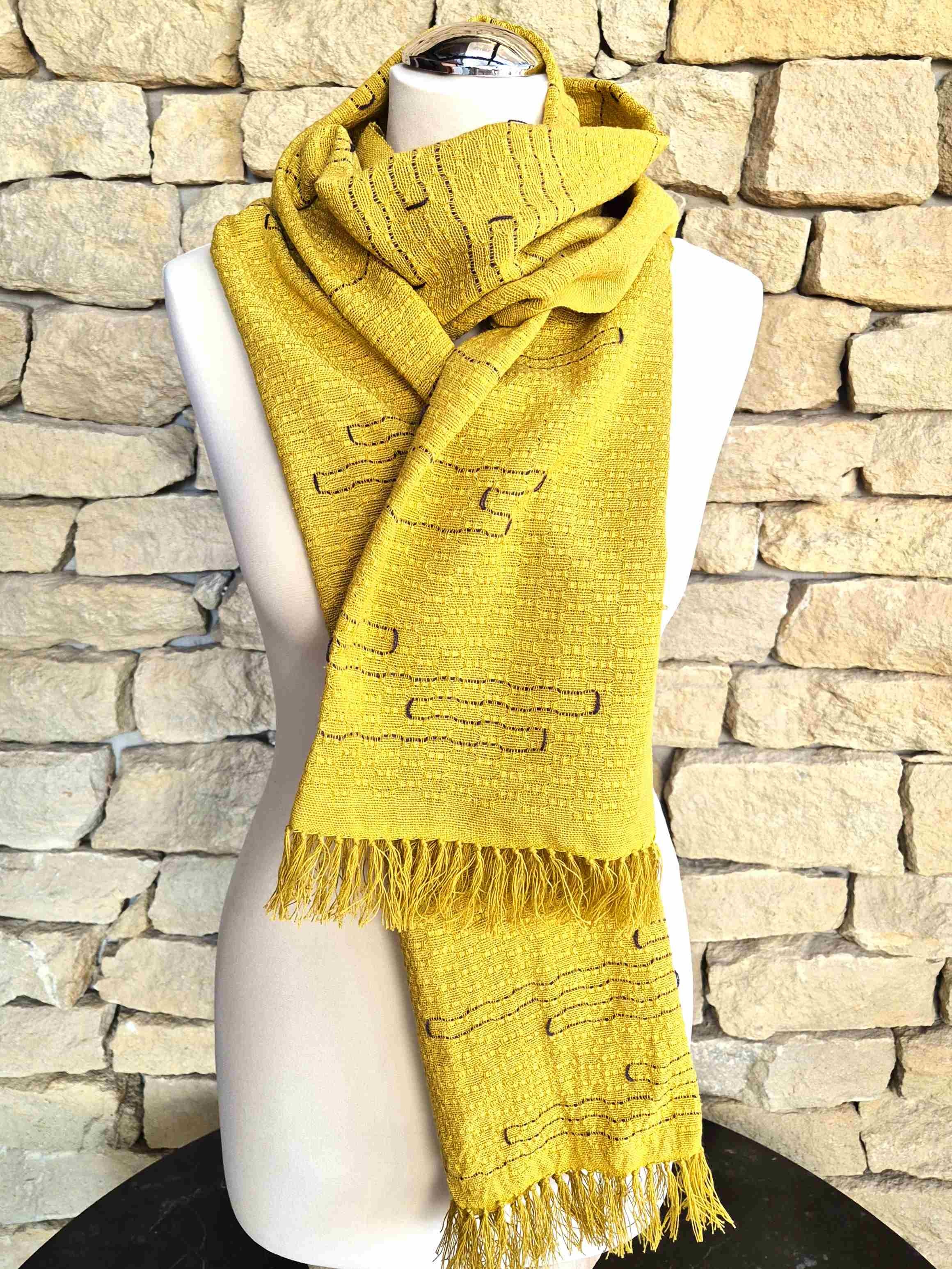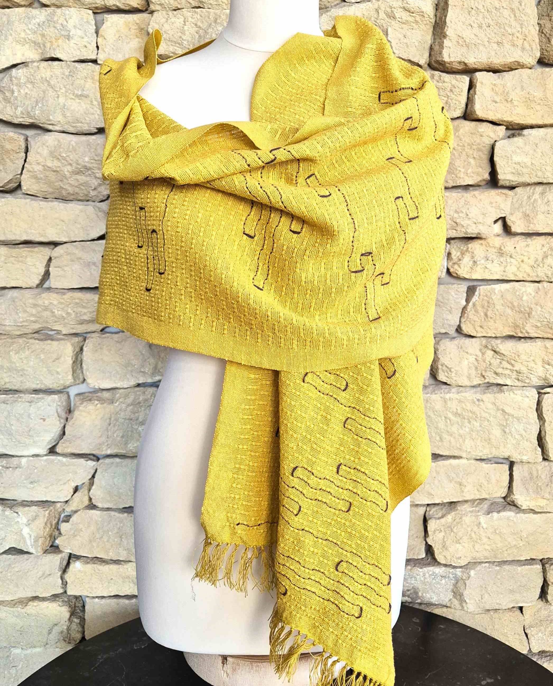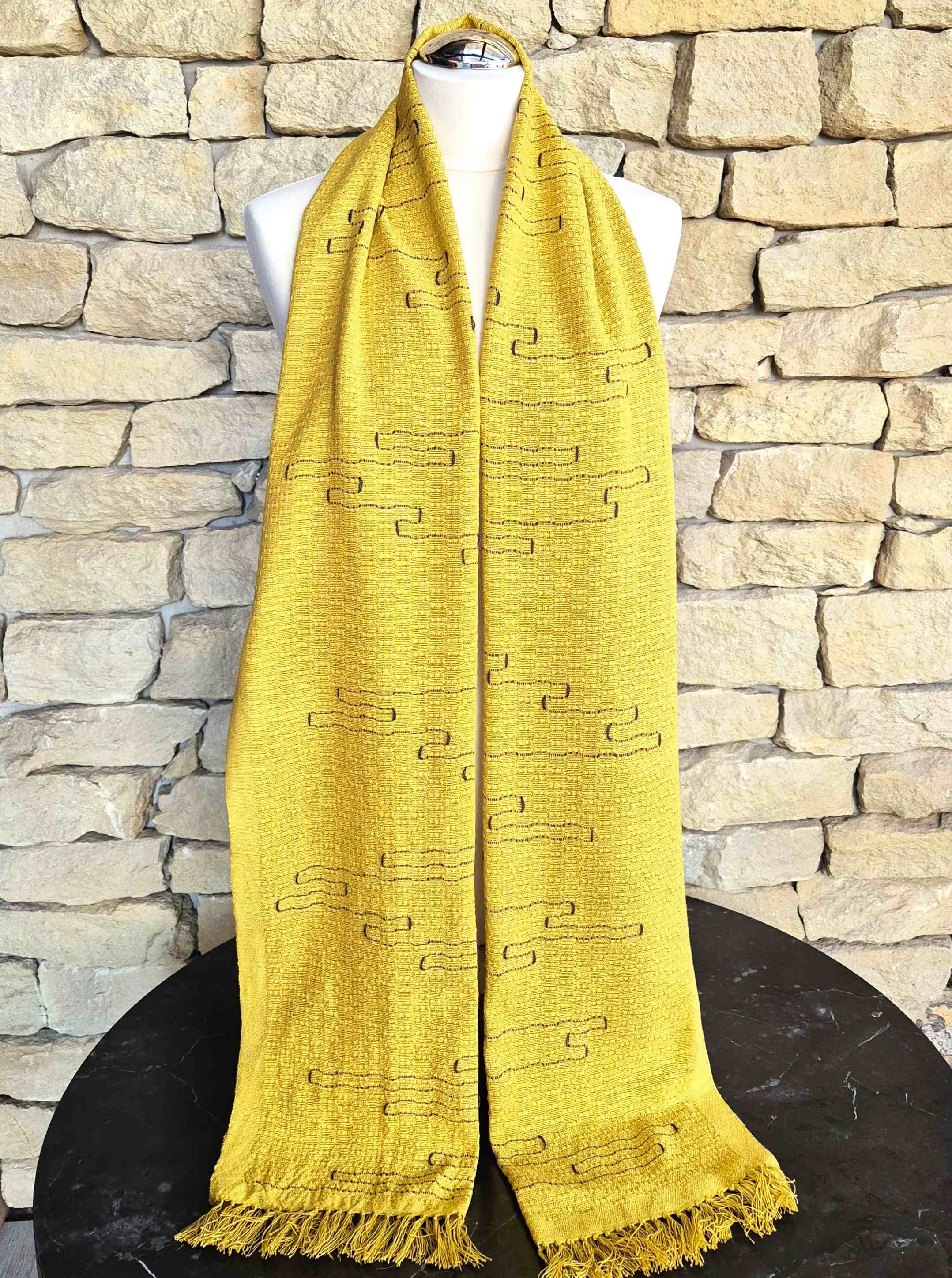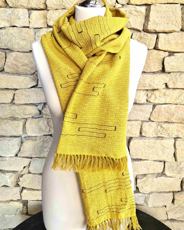 Kézzel szőtt luxus burette selyem sál. Burette selyemmel szőtt egyszínű, anyagában mintás sál fekete csíkozással. Minden szövésem művészi alkotás, adott hangulatomat vagy képi inspirációmat mutatja. A termék