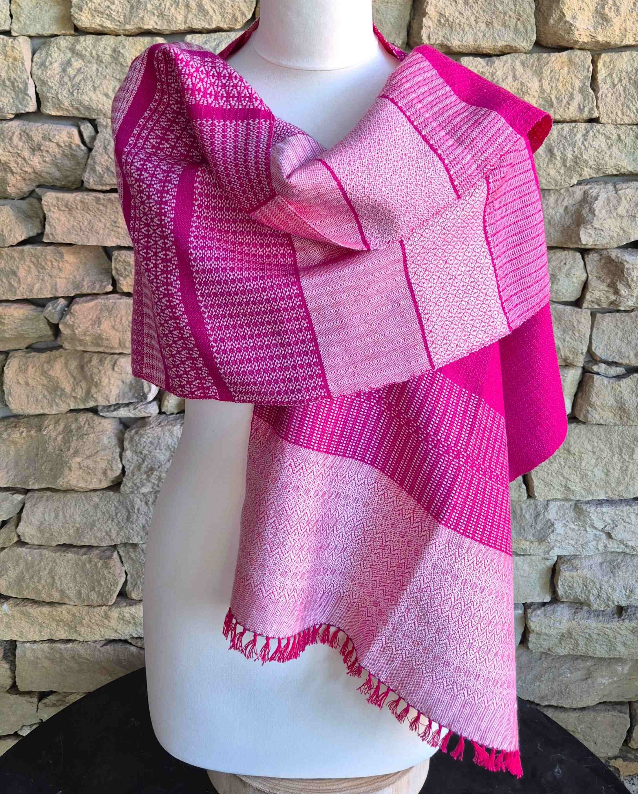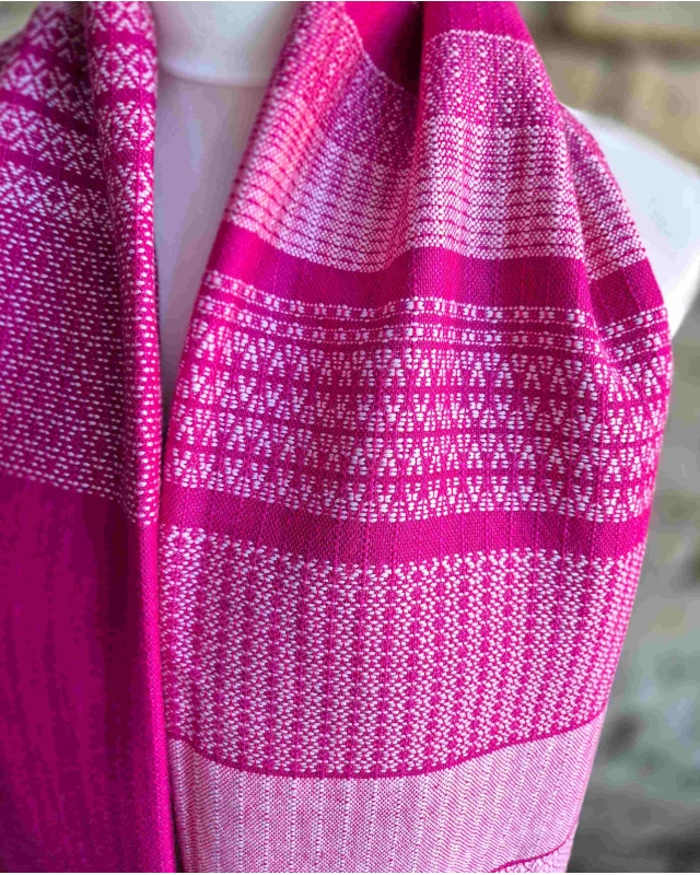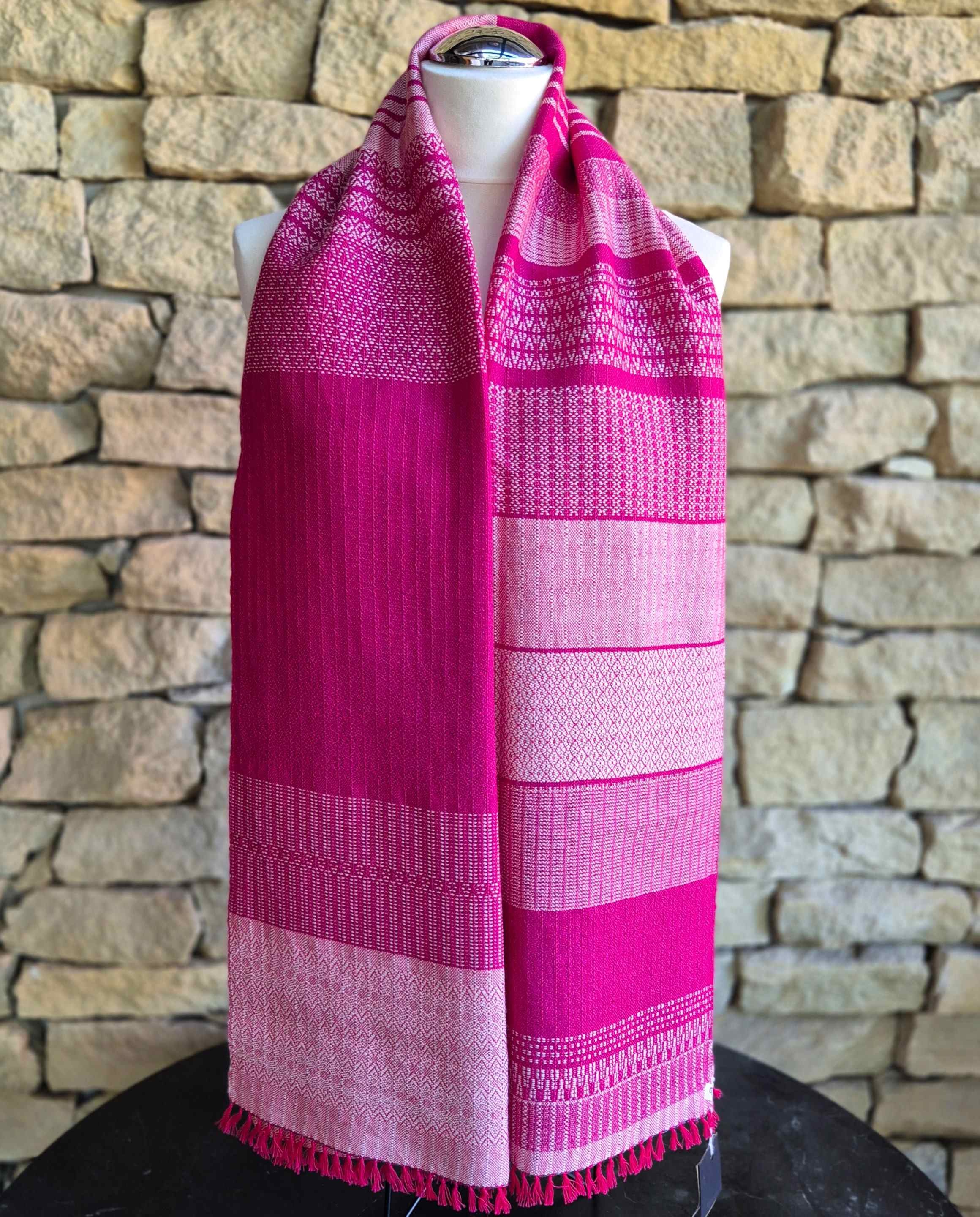 Kézzel szőtt luxus merinó/selyemsál. Takácsmintával és különböző csíkritmussal díszített merinó gyapjú és selyemsál.