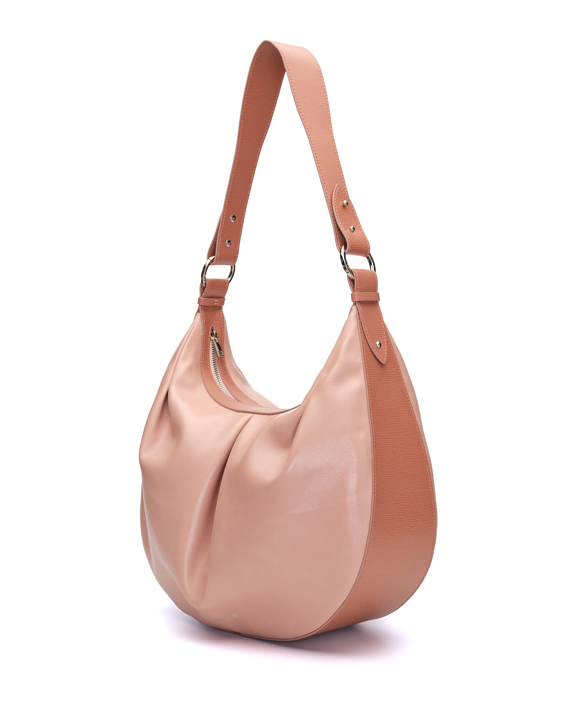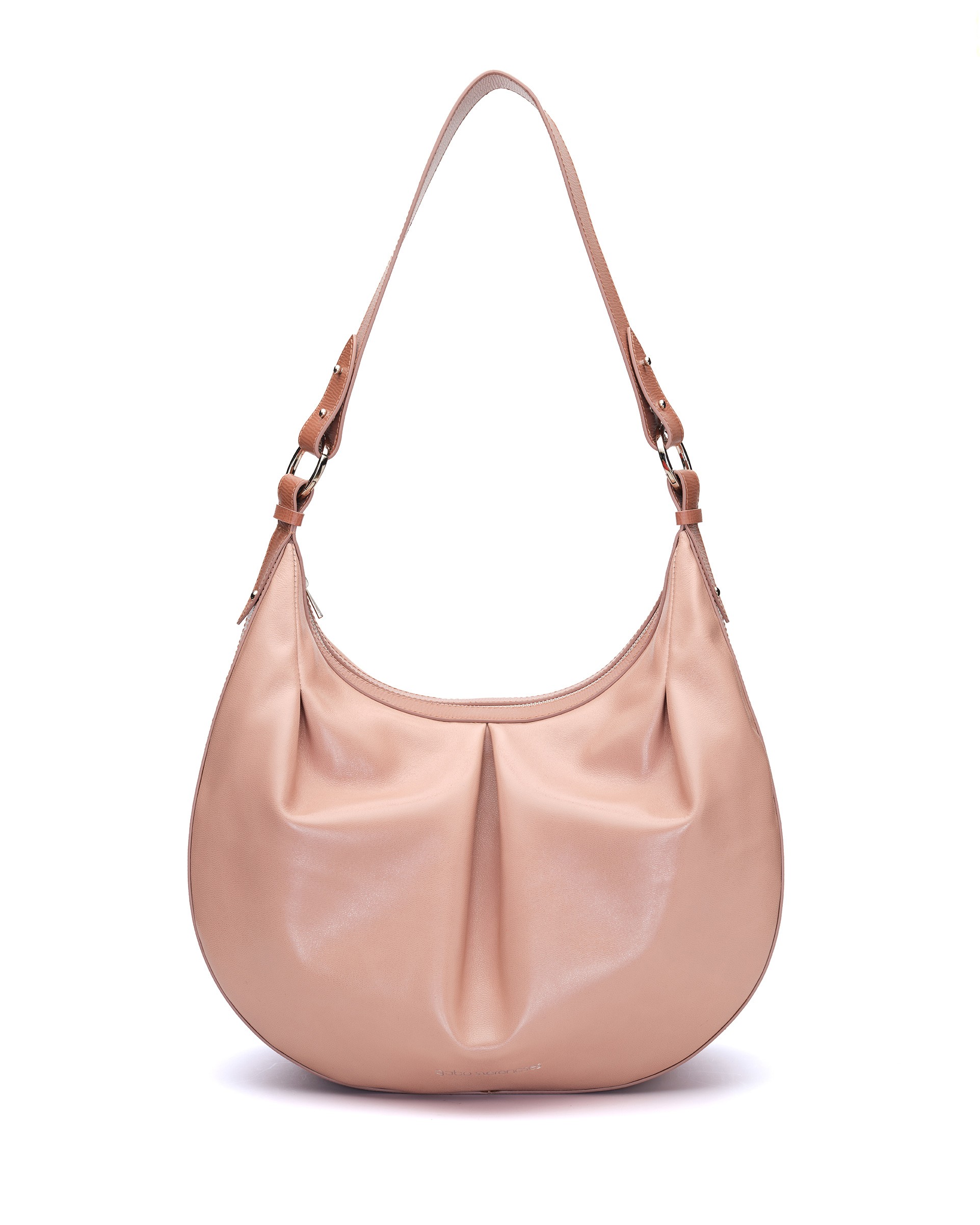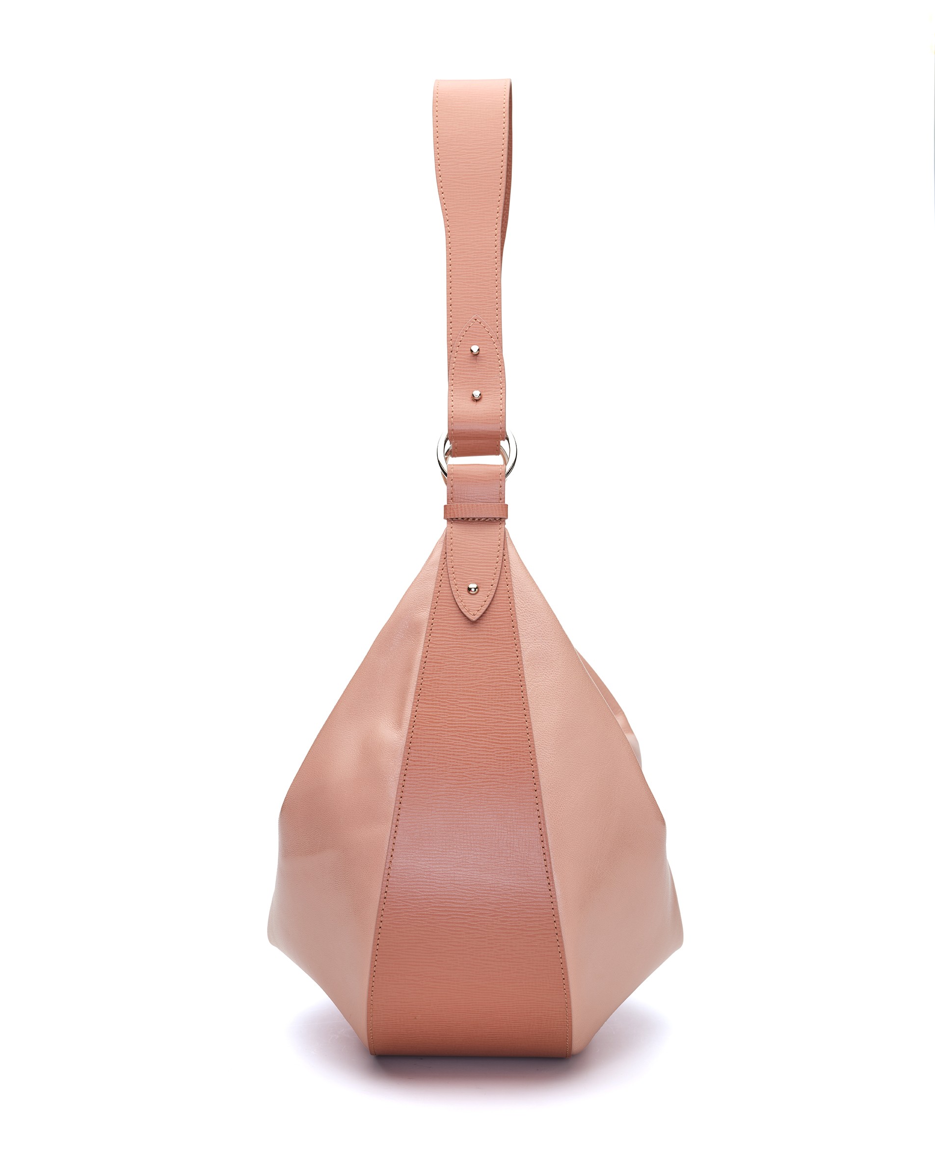 A kollekció különleges darabja, ívelt és lágy formavilággal, amely kiemeli a puha bőr természetes esését. Alja és fogója merevebb bőrből készül, így megtartja formáját, míg puha teste könnyűvé és jól pakolhatóvá teszi – ideális a mindennapokra.
