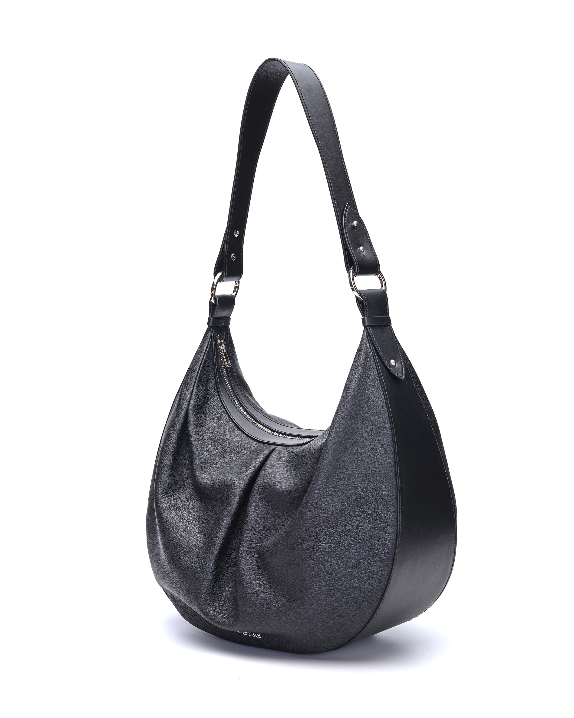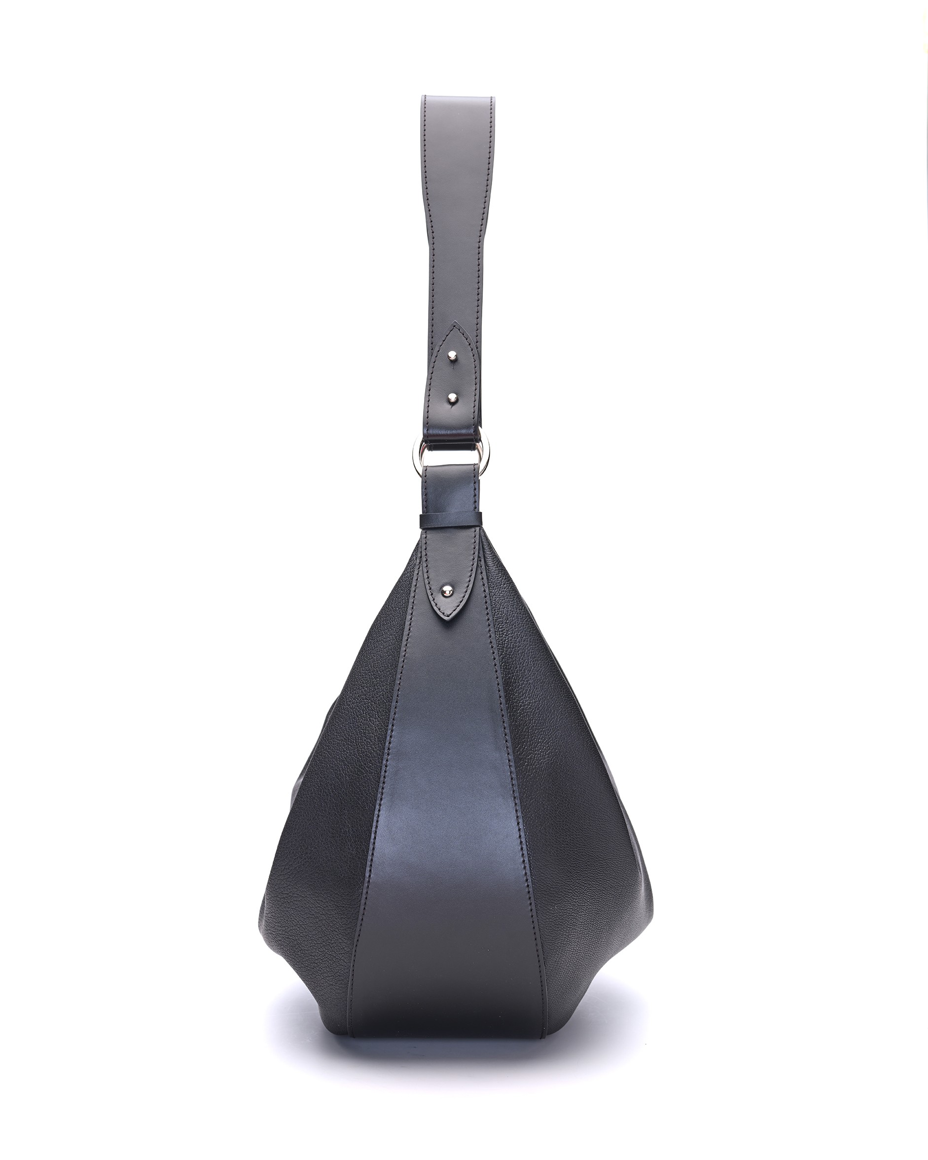 A kollekció különleges darabja, ívelt és lágy formavilággal, amely kiemeli a puha bőr természetes esését. Alja és fogója merevebb bőrből készül, így megtartja formáját, míg puha teste könnyűvé és jól pakolhatóvá teszi – ideális a mindennapokra.
