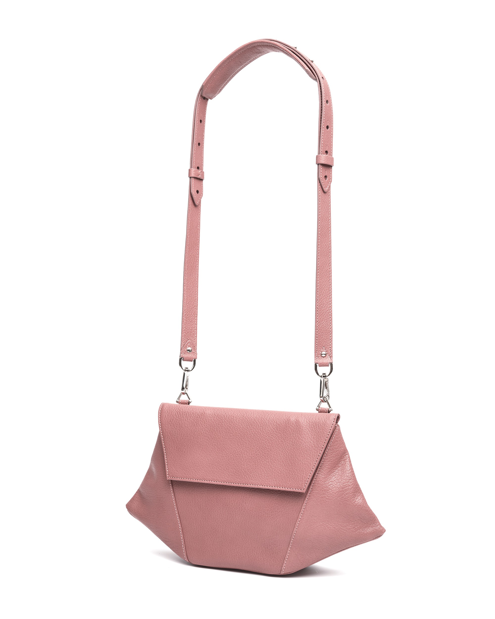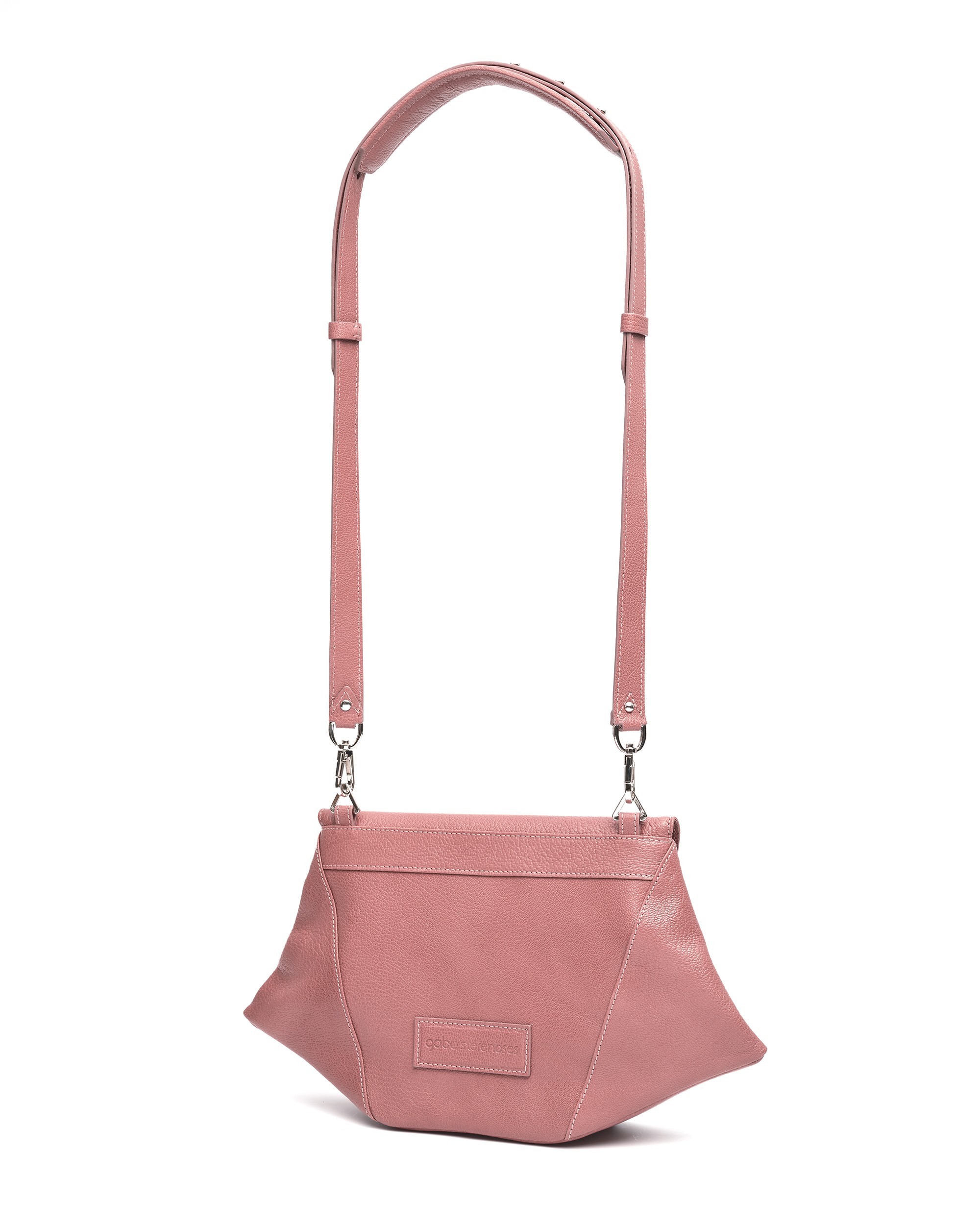 A táska tervezésekkor fontos szempont volt, hogy praktikus ugyanakkor rendhagyó forma szülessen. Igy jött létre ez a kicsi, geometrikus formavilágot követő, praktikus táska, mely hétköznap és alkalmi pillanatokban is megállja a helyét. Lecsatolható vállpántjának köszönhetően viselhető válltáskaként illetve clutchként is. A pánt szélessége 2,2cm, hossza állítható: 95cm és 133 cm között. A kényelmes viseletet egy szivacsos váll lap segíti mely 5cm széles és 22cm hosszan fekszik fel a vállra. itt található pisztolyszegekkel lehet állítani a vállpánt hosszát.