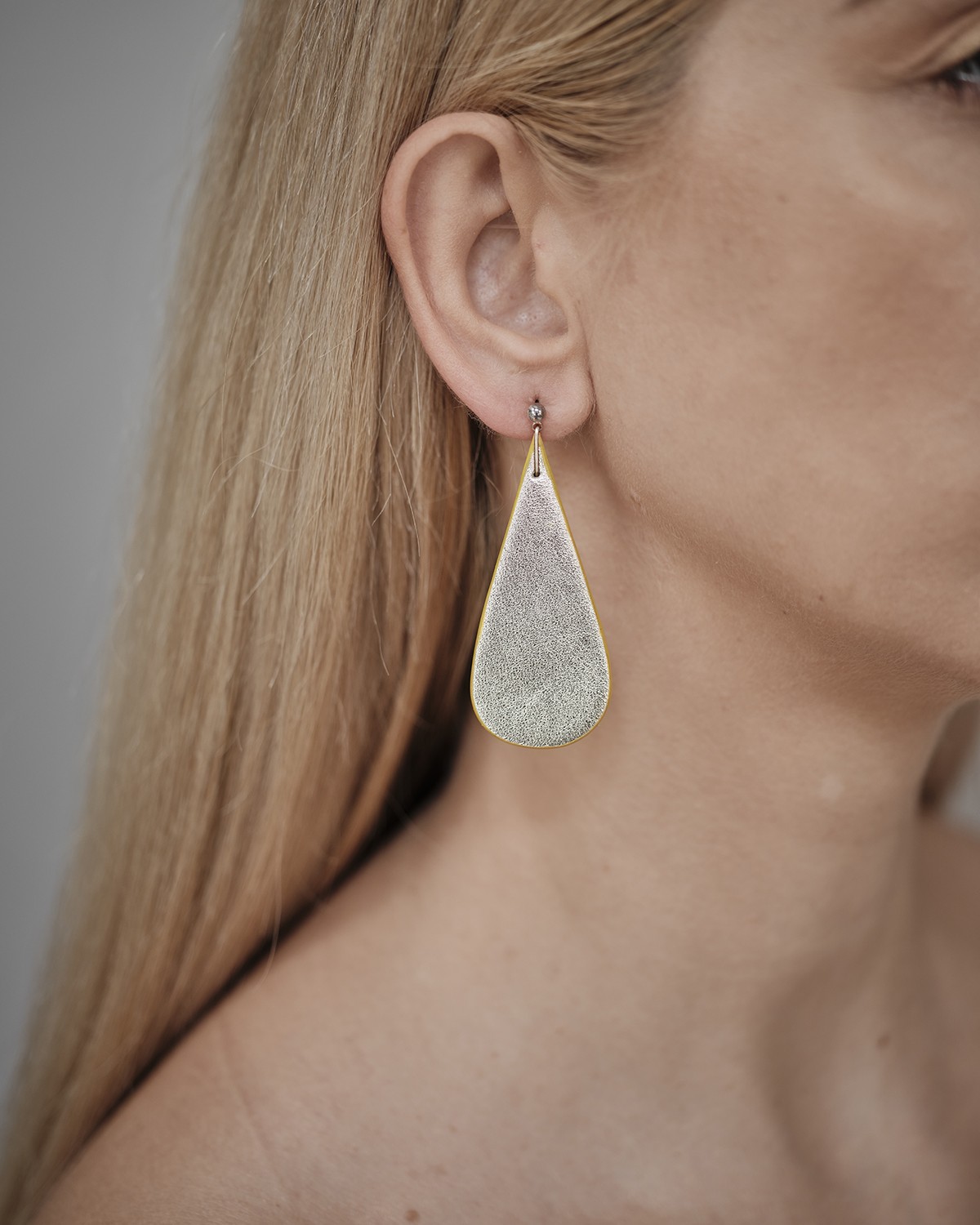 A zero waist programunk jegyében született bőr fülbevaló kellékei ezüstből készültek. Könnyű viselet, hossza 6,5cm, legszélesebb része 2,7 cm.